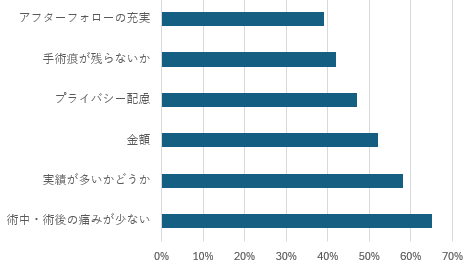 術中・術後の痛みが少ない:65% 実績が多いかどうか:58% 金額:52% プライバシー配慮:47% 手術痕が残らないか:42% アフターフォローの充実:39% 「痛みの少なさ」と「実績」が最も重視されていることが分かります。