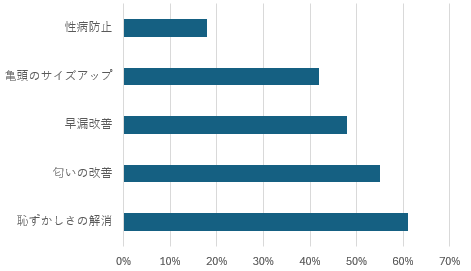 恥ずかしさの解消:61% 匂いの改善:55% 早漏改善:48% 亀頭のサイズアップ:42% 性病防止:18% 最も多かったのは「恥ずかしさの解消」でした。女性との性交渉時や大衆浴場など、露わにする機会での見た目での恥ずかしさがやはり最も気になるみたいです。具体的な悩みとしては、匂いが一番気になっているようで包茎であることでの垢が溜まりやすく不衛生になりがちであることの解消を求める声が多かったようです。 その他、「性病防止」や「早漏改善」など、健康面や性生活の質の向上を期待する声も多く寄せられました。