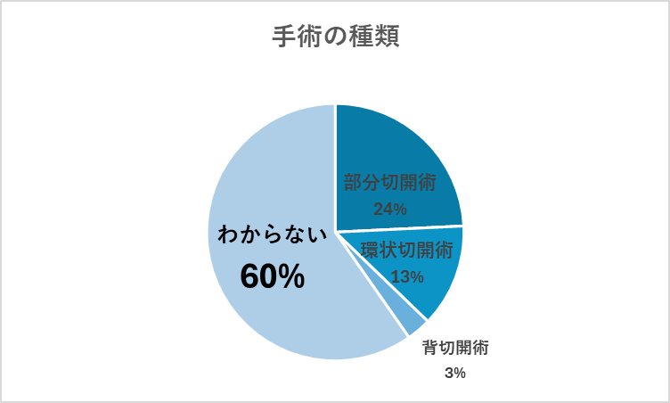 アンケートでは「どのような術式で手術を受けたのか、または検討しているのか」についても回答をいただきました。その結果、「わからない」と答えた方が全体の60%と最も多く、包茎手術の術式が一般的にはあまり認知されていないことが分かりました。 具体的に把握している方の回答を見てみると、部分切開術(24%)が最も多く、次いで環状切開術(13%)、背切開術(3%)という結果になっています。 包茎手術にはいくつかの方法があり、症状や希望によって選ばれる術式が異なります。アンケートでも「どの術式を選んだのか分からない」という回答が多かったように、一般の方にはあまり馴染みがない部分です。ここでは代表的な術式とその特徴を整理します。 それぞれの術式の特徴は以下のとおりです。 部分切開術 余分な包皮の一部を切除する方法。比較的簡易的な術式で、費用を抑えやすいというメリットがあります。ただし、切除量が少ない場合は再発リスクもあるため、症状によっては適さないこともあります。 環状切開術 亀頭の根元に沿って余分な包皮を環状に切除する方法。もっとも一般的で広く行われている術式で、確実に包皮を取り除ける点が特徴です。ただし、傷跡が目立ちやすい場合があるため、仕上がりを重視する人は注意が必要です。 背切開術 包皮の一部を縦方向に切開して広げる方法。比較的古くからある術式で、緊急処置として使われることもありますが、現在では美容性や仕上がりの観点から選ばれることは少なくなっています。