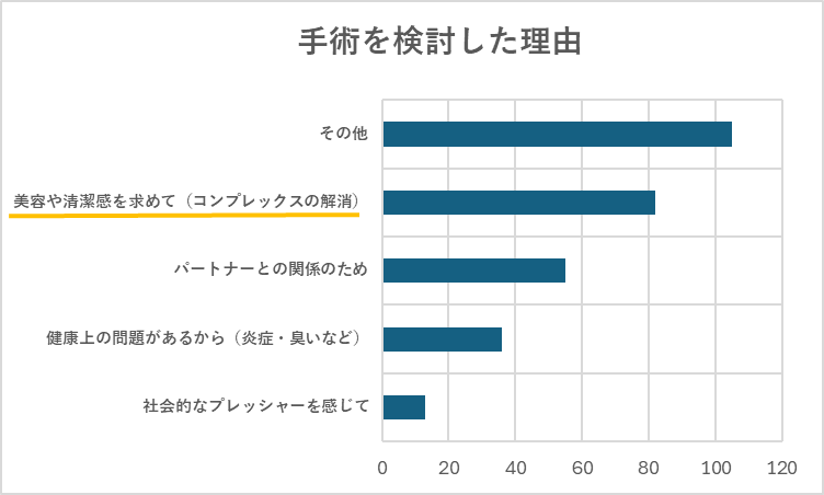 アンケートでは、包茎手術を検討した背景についても質問しました。その結果、最も多かったのは「その他」で、自由記述の中には「自分に自信を持ちたい」「長年の悩みを解消したい」といった声が多く見られました。 次いで多かったのは、「美容や清潔感を求めて(コンプレックスの解消)」という理由で、約80件の回答がありました。見た目に対するコンプレックスを克服し、清潔感を高めたいという心理は、幅広い世代で共通している傾向です。 「パートナーとの関係のため」という回答も多く、約60件に上りました。既婚者や恋人がいる人を中心に「性生活をより良くしたい」「相手に不快感を与えたくない」といった具体的な理由が挙げられています。 また、健康上の問題があるから(炎症・臭いなど)」と回答した人も一定数おり、医学的・衛生的な観点から手術を決断するケースも目立ちました。 一方で少数派ではありますが、「社会的なプレッシャーを感じて」という回答もありました。周囲の目や一般的な価値観に影響されて手術を考える人が存在することも分かります。