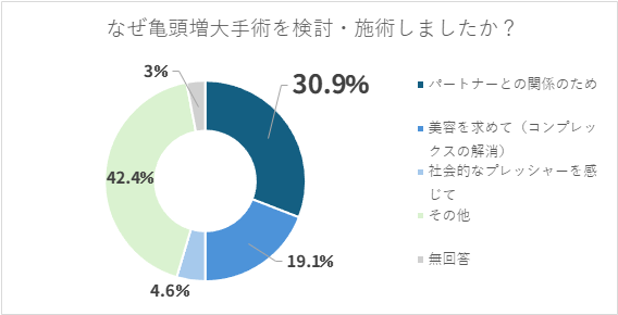 アンケート結果によると、手術の最も大きなきっかけは「パートナーとの関係をより良くしたい」でした。これは、手術が単なる見た目の問題だけでなく、性生活における自信や満足度向上にも深く関わっていることを示しています。それに次いで多かったのが、「美容を求めて(コンプレックスの解消)」でした。