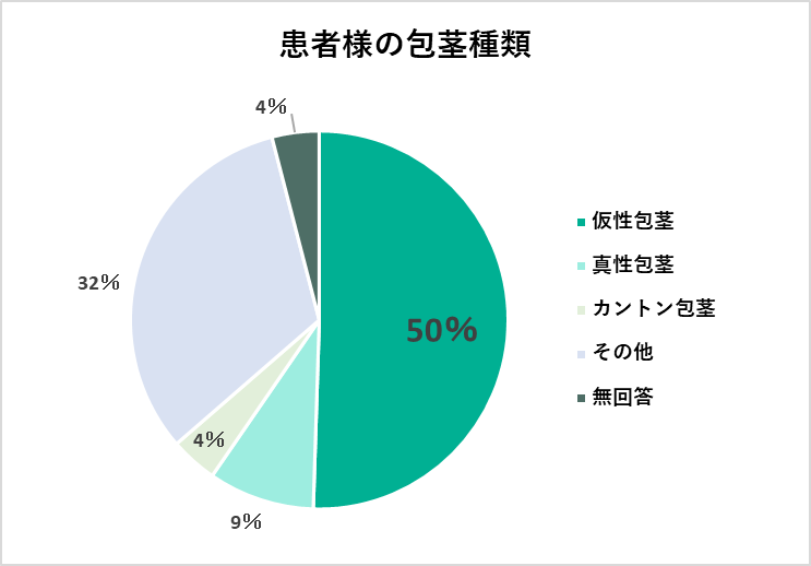 このデータに基づくと、仮性包茎が全体の約半数(50.0%)を占め、最も一般的な種類であると言えます。