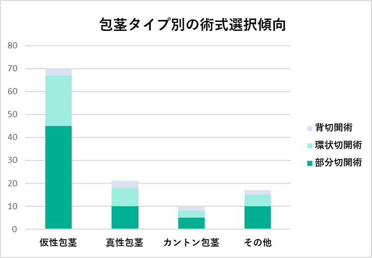 包茎の種類によって選ばれる手術術式には傾向があります。ここでは患者の包茎タイプ別に、選択された術式の構成比を可視化します。