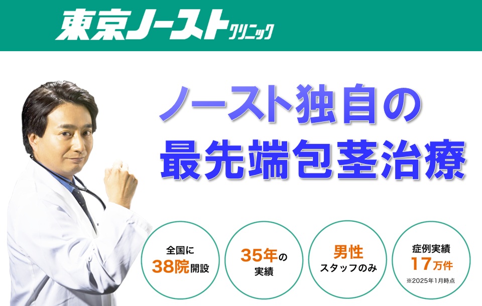 ノースト独自のクオリティが高い包茎手術技術「美容整形術」 ノースト独自のクオリティが高い包茎手術技術「美容整形術」では、一人一人の包茎の症状に合わせた方法を適用し、治療したことがわからない“自然な仕上がり”を実現します。 痛みについても安心して下さい。 テープ式麻酔やジェル麻酔などによる瞬間表面麻酔後に、速効性と持続性の麻酔を施すことにより、治療中はもちろん、治療後の痛みを感じることはありません。