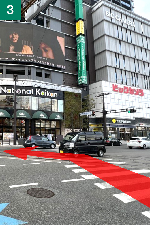 大通り(大州通り)を左折し左側歩道を市電の線路に沿って進み1つ目の信号をビックカメラ側へ渡ります