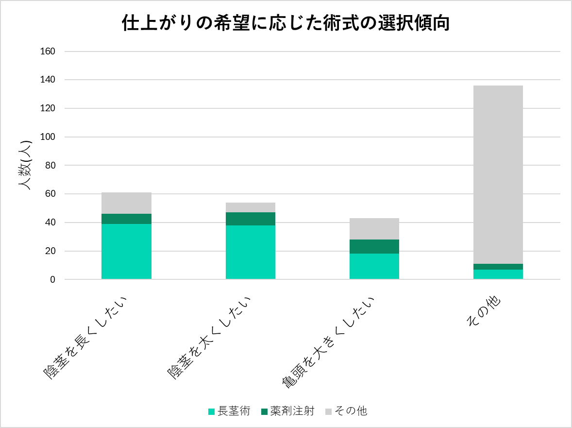 亀頭増大手術では、希望する仕上がりによって選ばれる術式が異なります。アンケートでは、長さ・太さ・その他の希望に対して、実際に選択された術式との関係性を分析しました。
